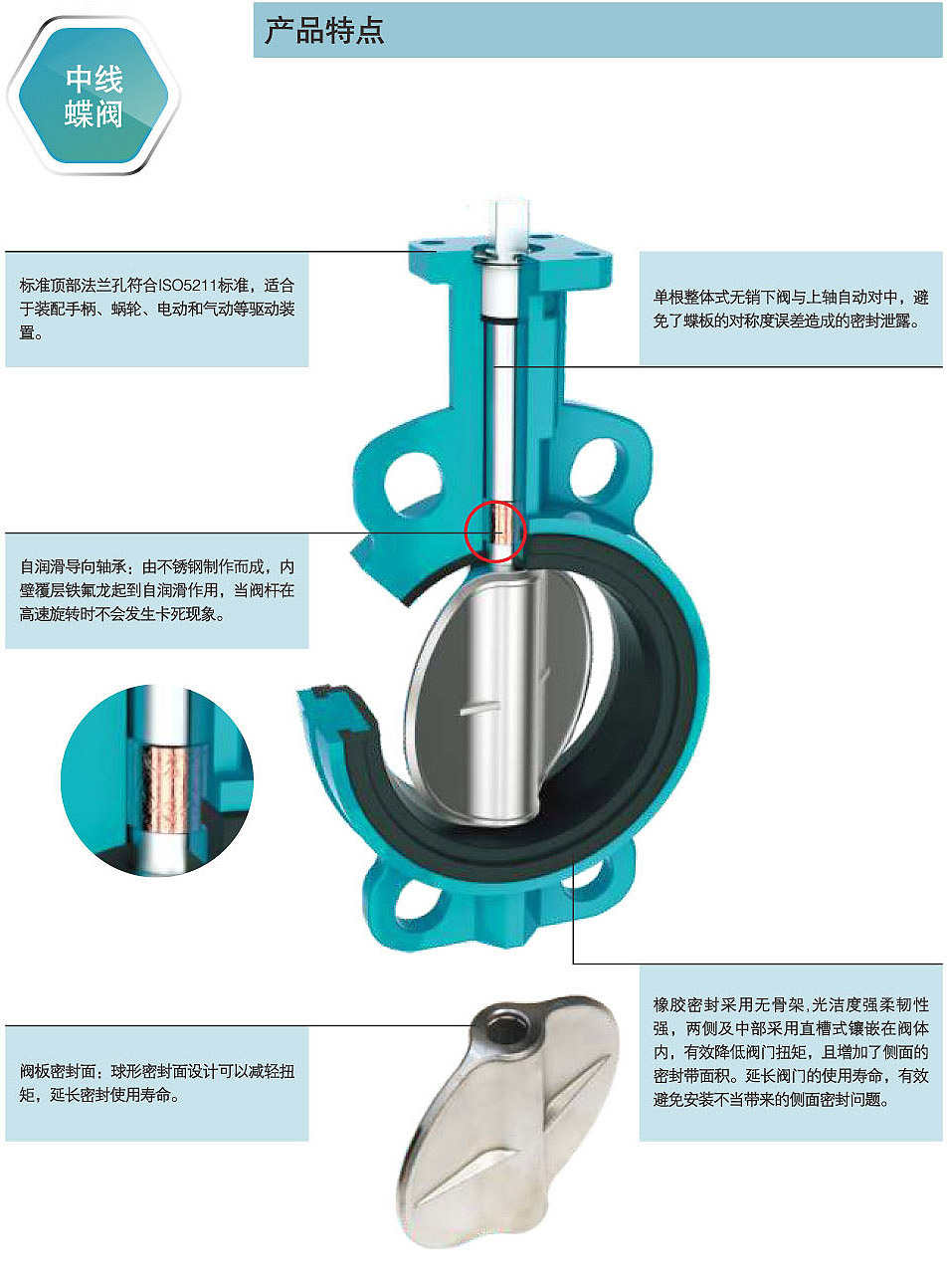 閥體:灰鑄鐵,球墨鑄鐵,鑄鋼,304不銹鋼,316不 銹鋼,316L不銹鋼 閥板:球鐵尼龍,球鐵電鍍,304不銹鋼,316不銹 鋼,316L不銹鋼,雙相不銹鋼,鋁青銅 閥座:三無乙丙(EPDM),丁腈(NBR),耐溫乙 丙(EPDM),氟橡膠,硅橡膠 閥軸:45碳鋼,410不銹鋼,304不銹鋼,316不銹鋼 公稱通徑:DN50-DN600 公稱壓力:PN1.0-1.6Mpa 適用介質:水,海水,污水,油,空氣,食品,弱酸 堿等 使用溫度:-20~220