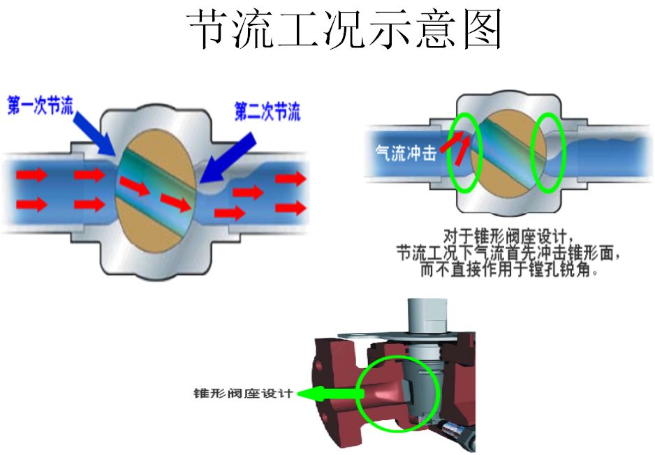 對于錐形閥座設(shè)計(jì)的旋塞閥,節(jié)流工況下氣體流入閥芯時(shí),氣流首先沖擊它前面錐形閥座的錐面,通過錐面的導(dǎo)向作用該表方向后進(jìn)入閥芯,而不是直接沖擊閥芯鏜孔的銳角,加之閥芯可以根據(jù)節(jié)流工況設(shè)計(jì)多樣的流動面、形狀和功能所以旋塞閥可以用于節(jié)流工況。